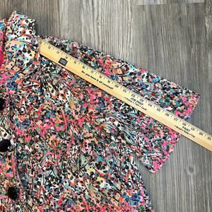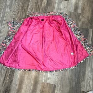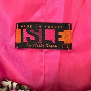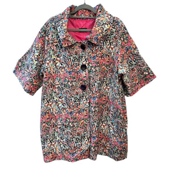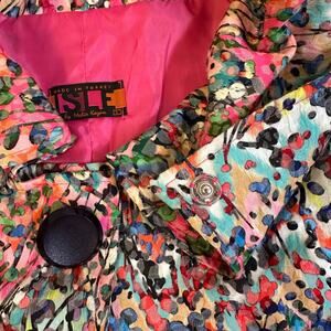 Make a statement with this fun, vibrant, multicolored abstract print jacket by ISLE, designed by Melis Kozan. Featuring bold black buttons, fastened with snaps, a stylish oversized collar, and a bright pink lining, this lightweight coat is perfect for layering in transitional weather.