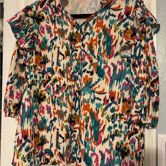 Vibrant blouse with an abstract print. Features a mix of colors including orange, teal, and pink. Perfect for adding a pop of color to your wardrobe.