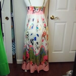 Vibrant dress with an abstract print featuring green, pink, and blue hues. Perfect for a bold fashion statement. JUST LEARNING HOW TO TAKE PICTURES!