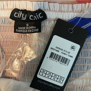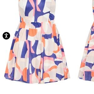 Vibrant dress with an abstract print. Features shades of blue, orange, and cream. Perfect for a bold look. Never been worn. Ready to ship.