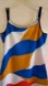 Vibrant dress with abstract print in blue, red, and yellow. Sleeveless design with a flattering fit.