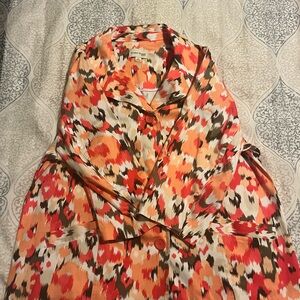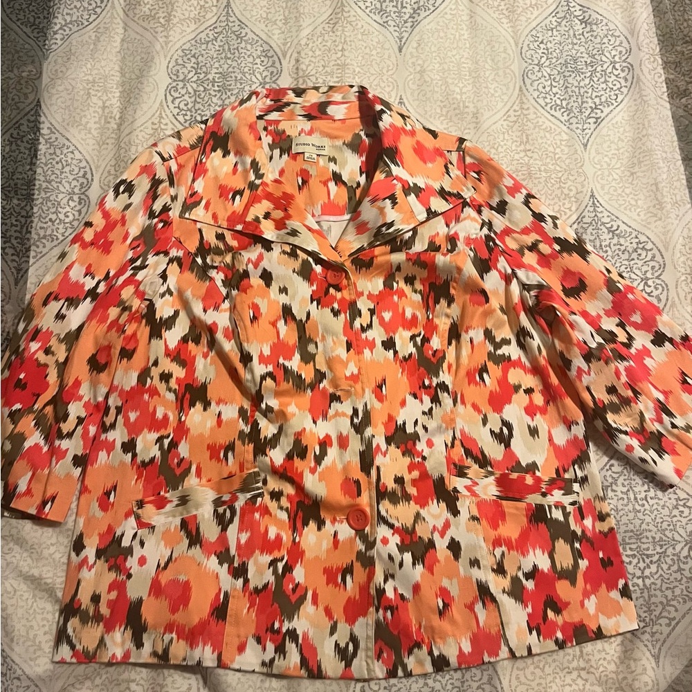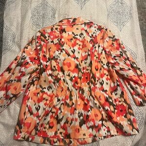 Vibrant jacket with an abstract print. Features shades of orange, red, and brown. Perfect for adding a pop of color. Great for a night out