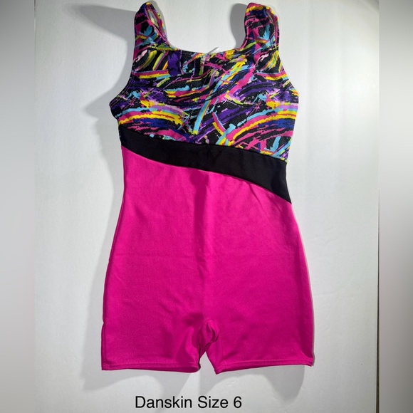Vibrant leotard with abstract print and pink bottom. Perfect for gymnastics, tumbling or dance.
