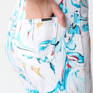 Vibrant pants with a unique abstract print. Features a mix of blue, gold, and white colors.