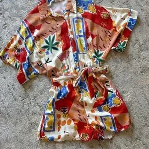 Vibrant abstract print romper with a relaxed collar. Multicolor design with bold red, blue, tan and green accents. Button-front and tie waist. Playful and easy to style.