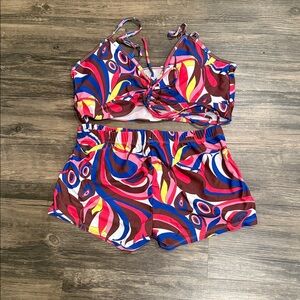 Vibrant two-piece set with abstract patterns. Features a strappy top and matching shorts. Perfect for a bold look.