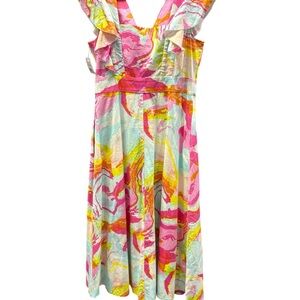 Embrace vibrant style with this colorful abstract print dress. Perfect for any occasion, this dress features a stunning mix of pink, yellow, and blue hues. Stand out with its unique design and comfortable fit.