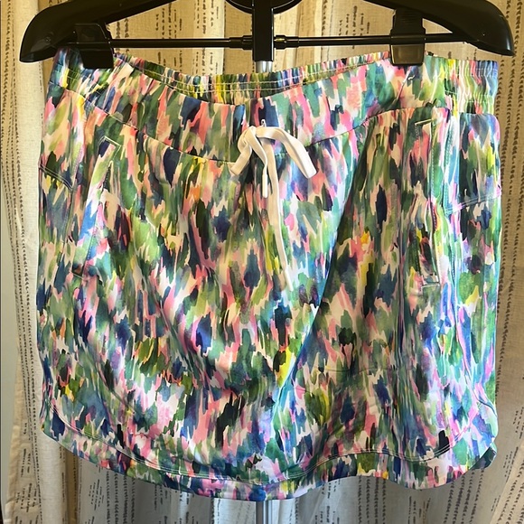 Vibrant skirt with an abstract print. Features a drawstring waist and pockets. Perfect for a bold look.