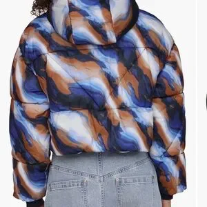 Stylish cropped puffer jacket with an abstract design. Features a mix of blue, brown, and white colors. Perfect for a bold fashion statement.