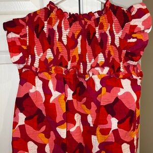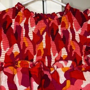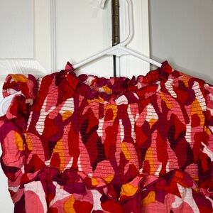 Vibrant top with abstract patterns in reds, golds, yellow and white. There is some gold thread woven in too. Features ruffle details and stretchy elastic on upper part of top.