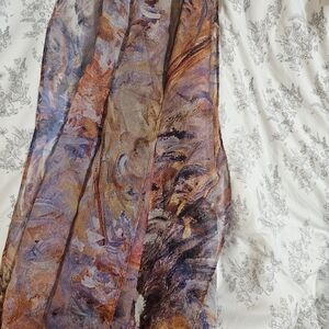Vibrant scarf with abstract patterns in purple, orange, and yellow.