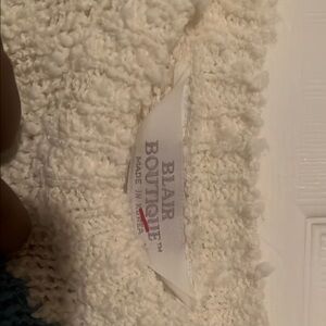 Cozy sweater with abstract design in pink, green, blue, and cream.