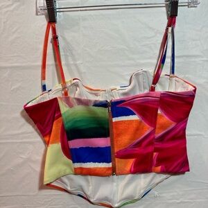 Vibrant two-piece set with abstract patterns. Features a crop top and mini skirt. Perfect for a bold look.
