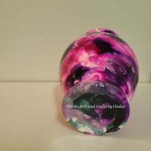 Vibrant hand painted vase with abstract pink, purple, and green patterns. Perfect for adding a splash of color to any room. Happy shopping!