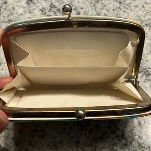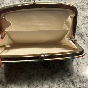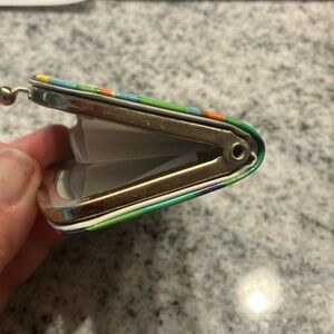 Vibrant wallet with abstract design. Features green, yellow, orange, blue, and purple swirls.