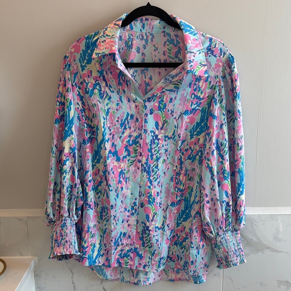 Vibrant women's top featuring a colorful abstract pattern. Perfect for adding a pop of color to your wardrobe.