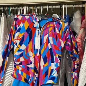Vibrant abstract design with a zip-up front. Features a mix of bold colors.
