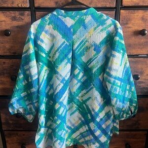 Elevate your style with this vibrant jacket featuring a striking abstract pattern. The blend of colors and fabrics is captivating. Believed to be a size large but the original tag is cut out