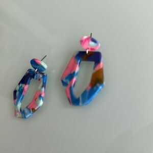 Add a pop of color to your outfit with these vibrant acrylic hoop earrings. Featuring a blend of pink, blue, and green hues, these earrings are perfect for any occasion.