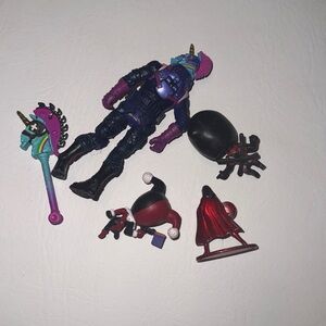 Set of colorful action figures featuring vibrant designs. Includes figures in shades of purple, blue, red, and black.