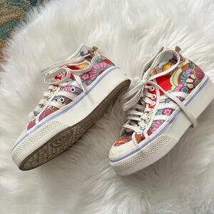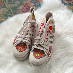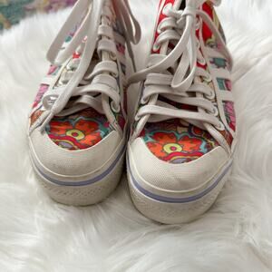 Pair of lace-up platform hi-top Adidas Nizza sneakers. Super fun and colorful! As pictured, there are a few scuffs and dirty spots, but still have plenty of life left. Really fun psychedelic print! Price reflects condition.