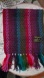 Vibrant alpaca wool scarf with fringe. Features stripes in pink, green, and blue. From Perú