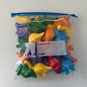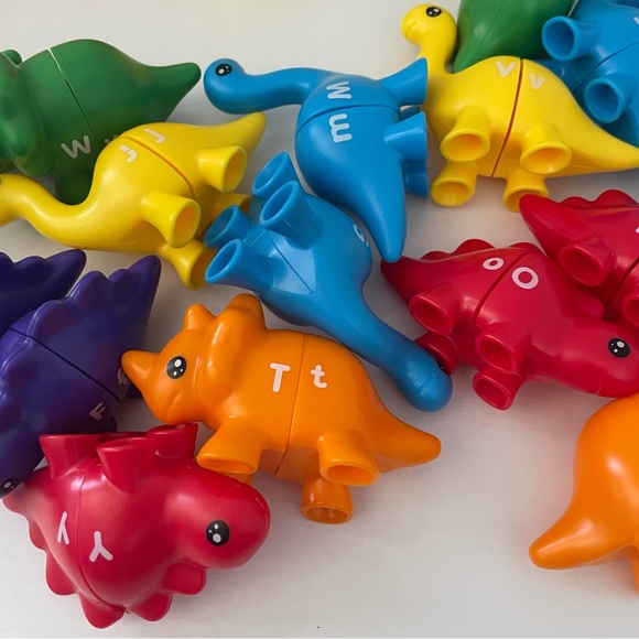 Bright multicolor dinosaur toys featuring alphabet letters for playful learning. Durable plastic pieces encourage letter recognition and imaginative play.