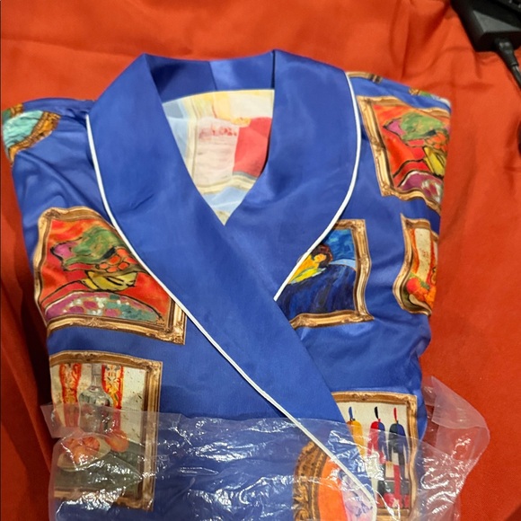Vibrant robe with artistic prints. Features a striking blue base with multicolor artwork.