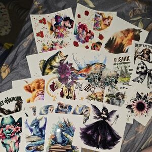 Vibrant collection of UV DTF decals featuring animals, flowers, and fantasy themes. Perfect for decorating and personalizing items. Total of 25 in this bundle