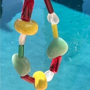 Bursting with bold, artistic flair, this handmade beaded bracelet is a celebration of color and creativity! Featuring a joyful mix of chunky red glass, yellow ceramic, clear frosted acrylic, lime green, and green aventurine heart-shaped beads, this piece is sure to turn heads. It’s secured with a detailed silver-tone toggle clasp, adding a touch of vintage-style elegance to its otherwise modern playfulness.
