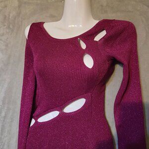 This dress weaves allure with elegance. The shimmering magenta fabric hugs the figure, while daring cutouts and a plunging back create an unforgettable silhouette.