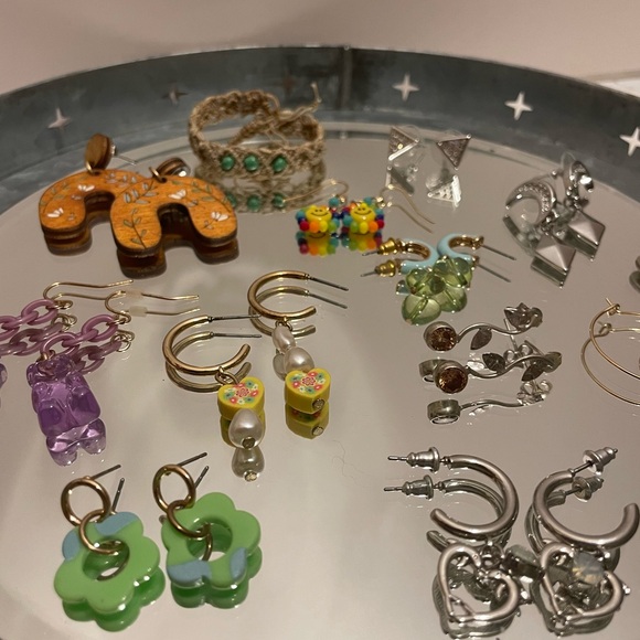 A vibrant collection of assorted earrings (12 earrings, 1 bracelet) with greens, purples, yellows, gold and silver colors.