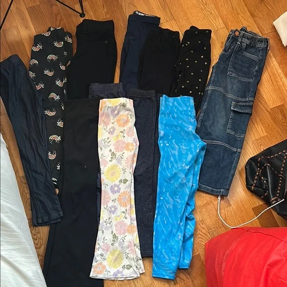 A collection of assorted girls pants size 6 and 7 featuring various colors and patterns. Leggings, flare, and one pair of jeans. Used and good condition. No rips, tears, or stains.