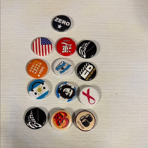 Set of assorted pinback buttons with various designs and colors. Perfect for accessorizing bags or jackets or belts.
