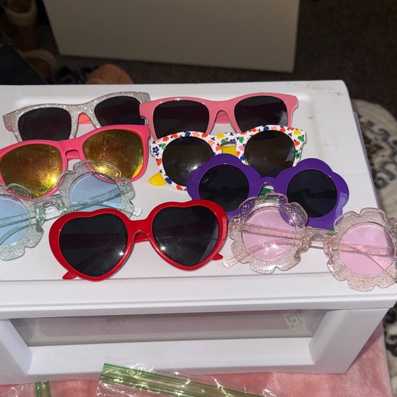 Kids Sunglasses. A vibrant collection of assorted sunglasses. Includes red heart-shaped, purple round, and pink floral designs. Perfect for adding a pop of color to any outfit.