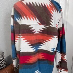 Vibrant jacket with an Aztec pattern. Features a mix of red, blue, and white colors. Button-up front with chest pockets. Preowned worn maybe one time excellent condition freshly laundered smoke free home super soft and cute. It’s like a fleece material hundred percent polyester.