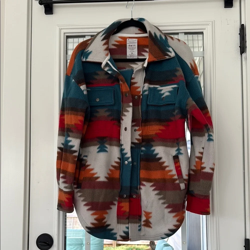 Vibrant jacket with an Aztec pattern. Features shades of red, orange, teal, and cream. Perfect for a bold look.
