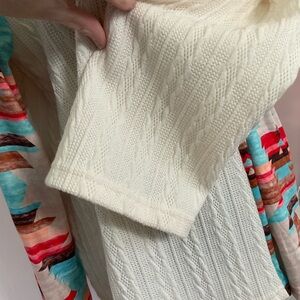 Vibrant sweater with a unique pattern. Features cream and multicolor design.