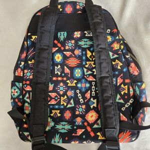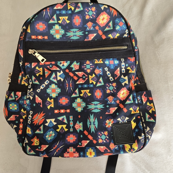 Vibrant Aztec-print backpack. Bold multicolor geometric pattern. Front zip pocket, side pockets, laptop pocket. Comfortable shoulder straps. Fun statement accessory.
