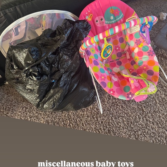 Bright and engaging baby rocker chair with a playful design. And bag full of miscellaneous toys/stuffed animals for a girl