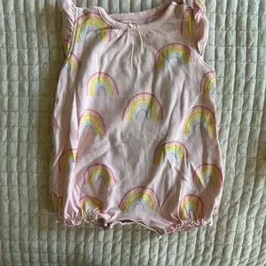 Set of five baby rompers in various colors and patterns. Includes polka dots, stripes, floral, rainbows, and a turtle design.