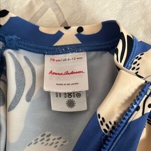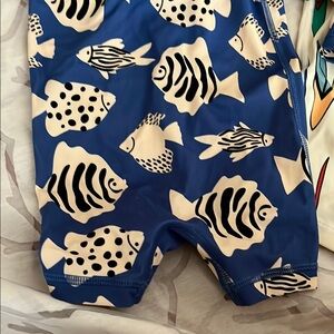 Set of two Hannah Andersson rashguard swimsuits with fun patterns. One features a blue and cream fish design. The other has a multicolored surfboard pattern. Perfect condition — not even sure they were worn into the water