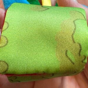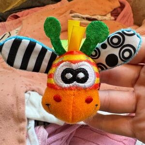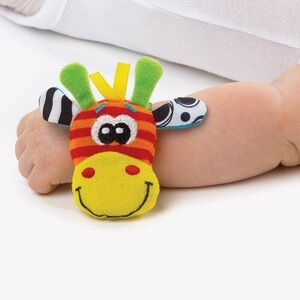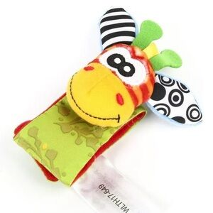 Bright and soft plush wrist rattle with Velcro closure. Stimulates baby’s vision and hearing with bold patterns and gentle sound. Great for tummy time or stroller play.