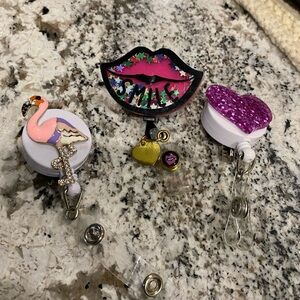 Add flair to your accessories with this vibrant badge reel set. Featuring a playful flamingo, a colorful lips design, and a sparkling heart, these reels are perfect for adding personality to your daily wear. Ideal for work or school, these badge reels are both functional and stylish.two never used .