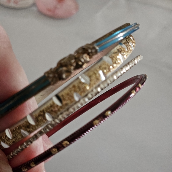 Set of stylish bangles in blue, gold, and red. Perfect for adding a pop of color to any outfit. **these are small so maybe petite hands or kids