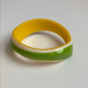 Set of two vibrant bangles. Features red, yellow, green, and cream colors. Perfect for adding a pop of color to any outfit.