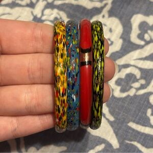 Add a pop of color to your outfit with this vibrant bangle set. Featuring red, blue, yellow, and black hues, these bangles are perfect for any occasion.