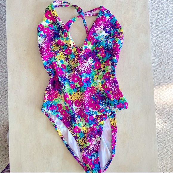 Colorful one piece with sexy open back. Crisscross straps, ties in back.