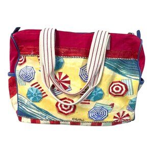 Colorful Beach Themed Canvas Tote Bag Red & White Striped Handles Paul Brent