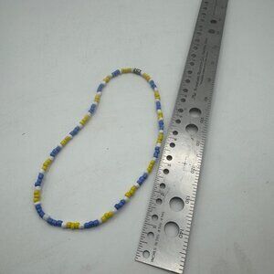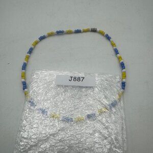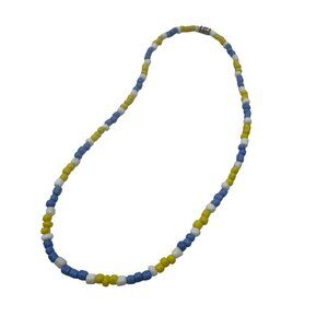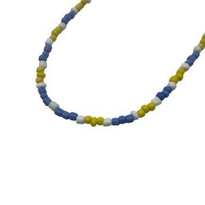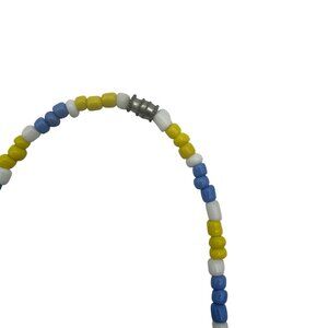 This handmade beaded necklace features alternating yellow, blue, and white beads, creating a colorful and vibrant design. It is secured with a magnetic clasp for ease of use and measures 16 inches in length, making it versatile for various occasions or styles.